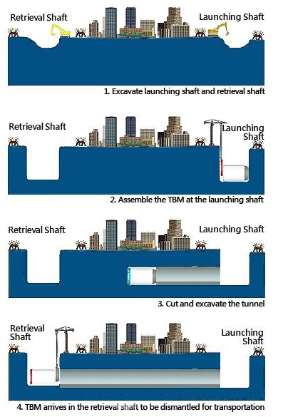 TBM 공법커터헤드(Cutterhead)를 회전시켜 지반을 굴착한 뒤, 내부에서 자동화된 방식으로 버력 반출, 세그먼트 조립, 막장압 유지 등을 수행한다. 주로 쉴드 TBM 방식이 사용되며, 지반 상태에 따라 이수식(Slurry Pressure Balanced, SPB)토압식(Earth Pressure Balanced, EPB)으로 나뉜다.